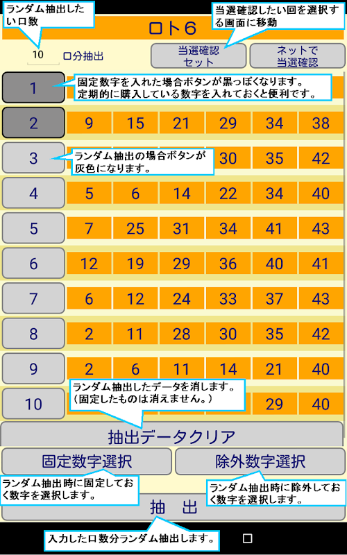ミニロト、ロト6、ロト7、ナンバーズ3、ナンバーズ4の各クジごとに番号を任意に抽出するアプリです。