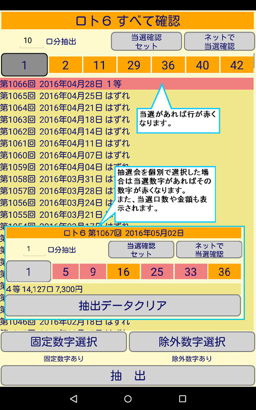 保持しているすべて過去の当選結果と抽出した数字とを確認できます。