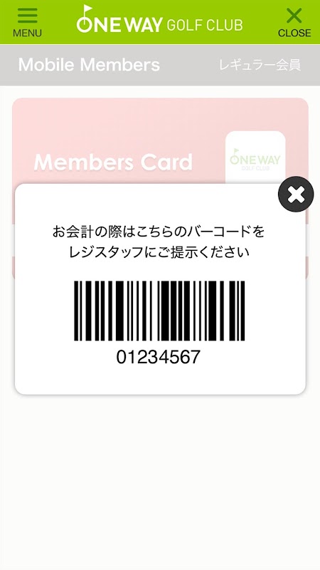 「会員番号バーコード」の表示機能は、受付時などに提示することで、スムーズな会計が可能です。