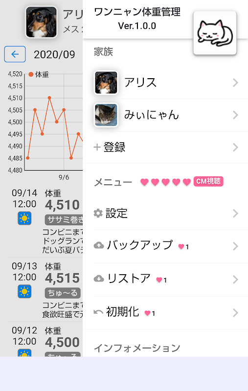 „Wan Nyan Weight Management” to aplikacja, która wspomaga rejestrowanie rozwoju rodzin, takich jak psy i koty. Oczywiście może być również używany przez ludzi.