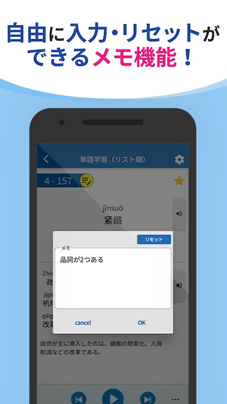 Ta aplikacja do nauki słownictwa oparta jest na programie nauczania HSK („Międzynarodowe Standardy Poziomu Nauczania Języka Chińskiego”) i zawiera całe słownictwo, tłumaczenia na język japoński oraz przykłady audio!
