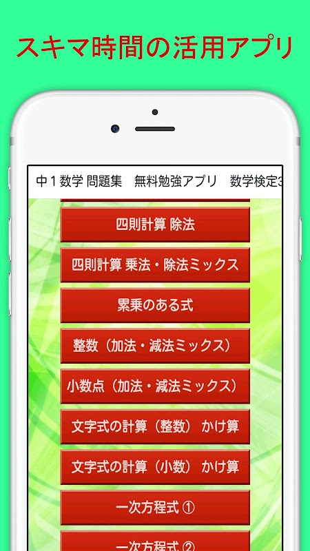 このアプリは、中1の数学で勉強する基礎的な計算式を中心にした問題集で、無料アプリです。
