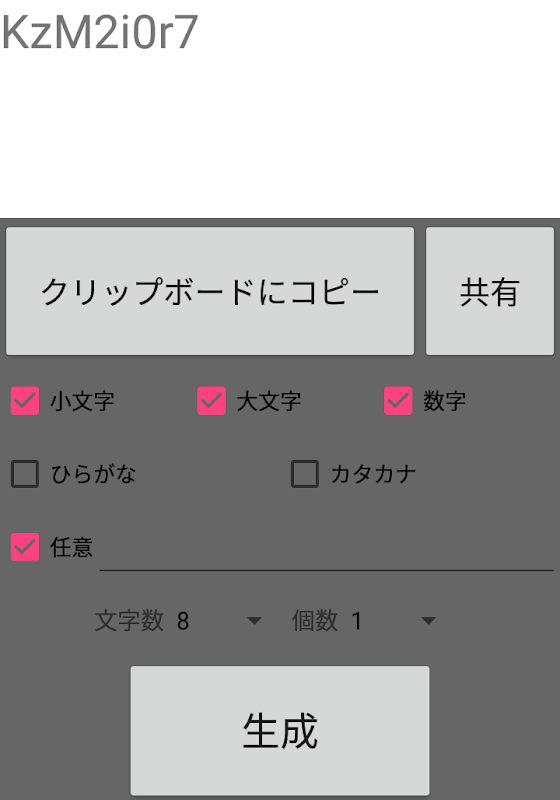 このアプリでは、小文字・大文字・数字の様々な組み合わせで、各ユーザが求めるセキュリティの強度を実現します。もちろん、数字だけや小文字だけなども選択できます。
