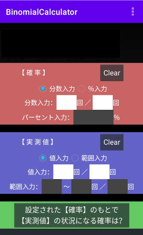 ・入力した数値をもとに二項分布の計算を行い、結果を表示します。