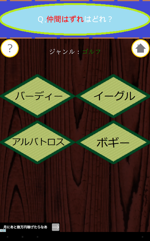 次々に出題される4つの項目から仲間はずれを探す雑学クイズゲーム。