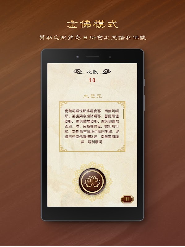 - Liczenie podczas recytacji imienia Buddy. Za każdym razem, gdy recytujesz sutrę, mantrę lub imię Buddy, kliknij ekran, aby policzyć.