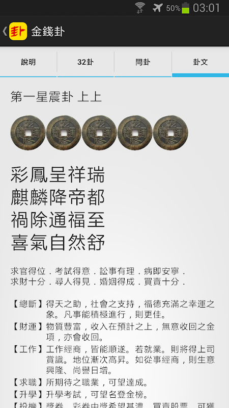 「深色」和「淺色」選擇(主畫面右上方);修正「金錢卦」卦文解釋(多謝 Queenie 反饋問題。最後發現台灣版和香港版卦文次序有異,因此錯誤配對卦文與解釋)