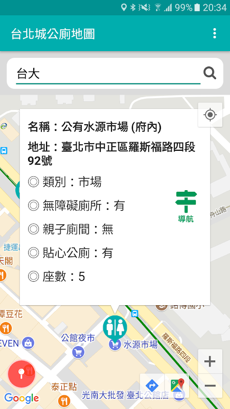 2. 可輸入台北市的路名/地址/景點名稱(例如:台北101、台大醫院、和平東路二段339號...等)來查看周邊的公共廁所。