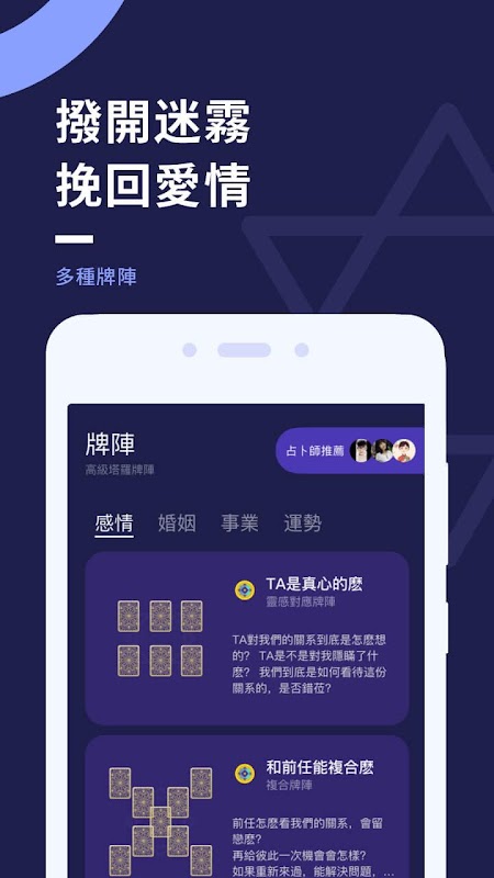 Oprogramowanie aplikacji zawiera tablice kart tarota wysokiego poziomu, takie jak miłość, kariera, bogactwo, itp., których można doświadczyć jednym kliknięciem, a także może pomóc w bardziej profesjonalnym i dogłębnym poznaniu wskazówek dotyczących przeznaczenia.