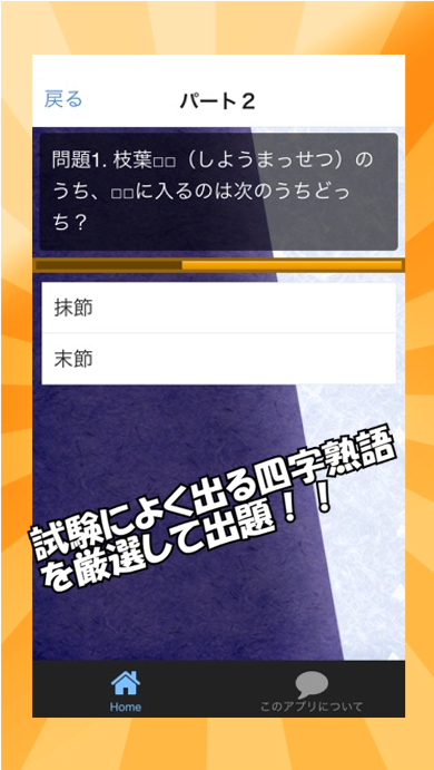 四字熟語の一部について、正しい漢字を二つの選択肢から判別してもらいます。