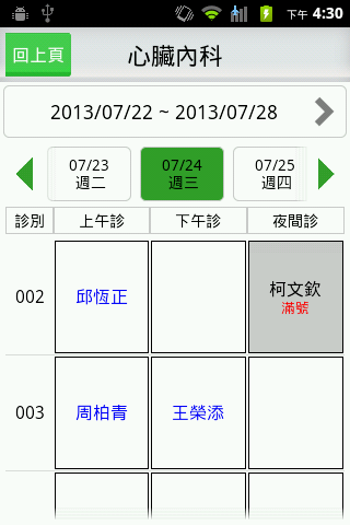 2. 行動掛號:提供民眾來院門診看診掛號服務,掛號時,可即時查詢門診班表與預約狀況,如預約是否額滿,門診停診與代診資訊等。