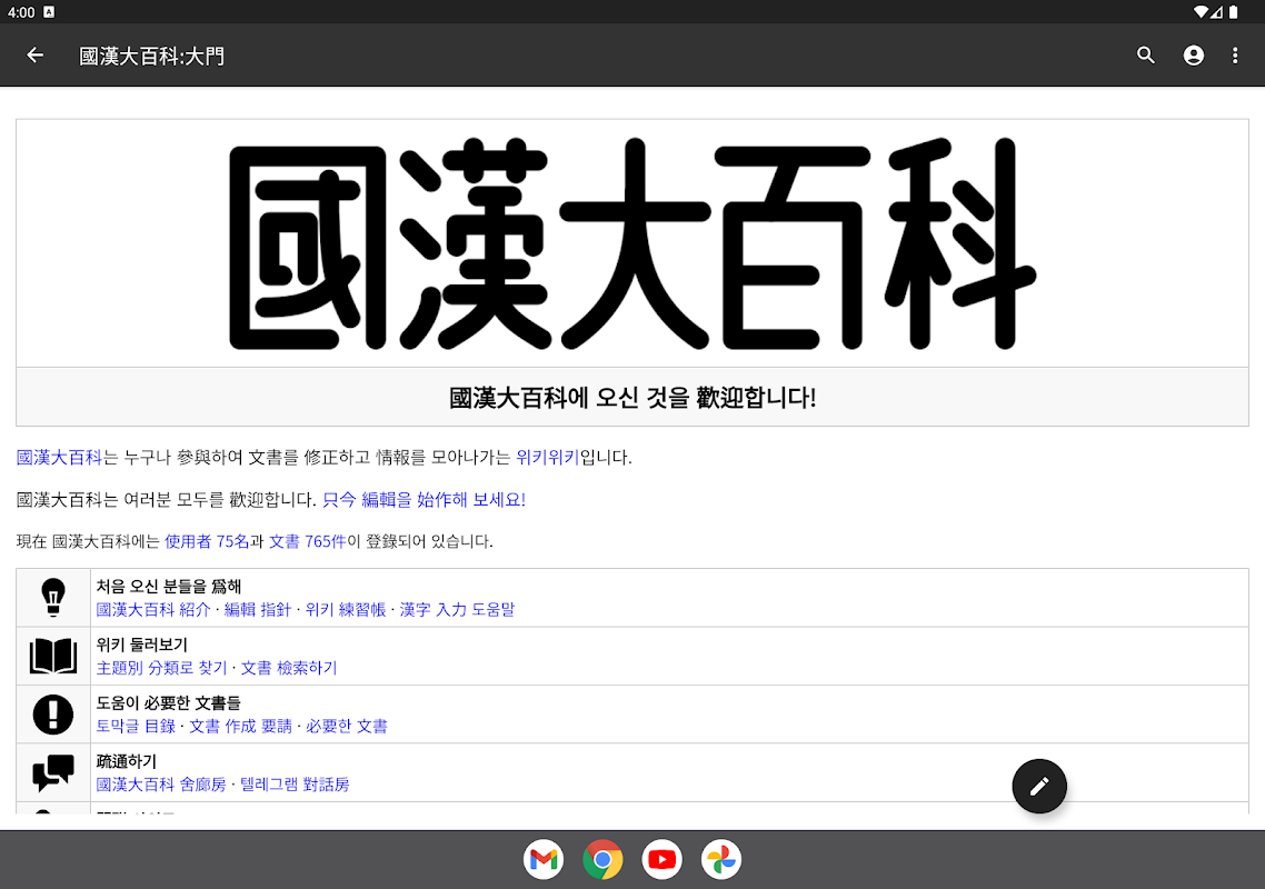 Jeśli lubisz czytać Wikiwiki, która jest zbiorem wszystkich informacji z całego świata dostępnych w Internecie, zwłaszcza witrynę wiki o nazwie „Enhagye”, polecamy 《國漢大百科》. Właściwie nic specjalnego. Naszym celem jest stworzenie wiki pełnej dokumentów, które będą przyjemne w czytaniu, zgodnie z duchem Enha Wiki. Z „mieszanym wykorzystaniem tekstów koreańskich i koreańskich”.