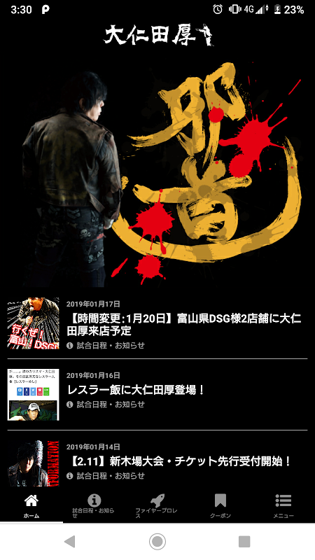 このアプリは大仁田厚の公式アプリです。大仁田厚の試合日程、イベント情報、メディア出演などの各種最新情報や、お得なアプリ限定クーポンなどを配信します。