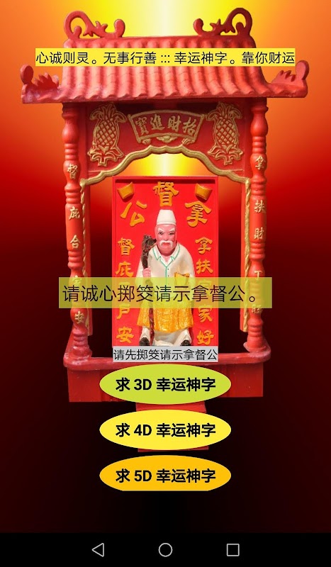 这款大马拿督公幸运神字,特别收录了大马槟城乔治市一座拿督公庙里上百年历史的拿督公神像。这款手机应用程式,可以求:千字(3D)、万字(4D)、十万字(5D)和百万字(6D)。