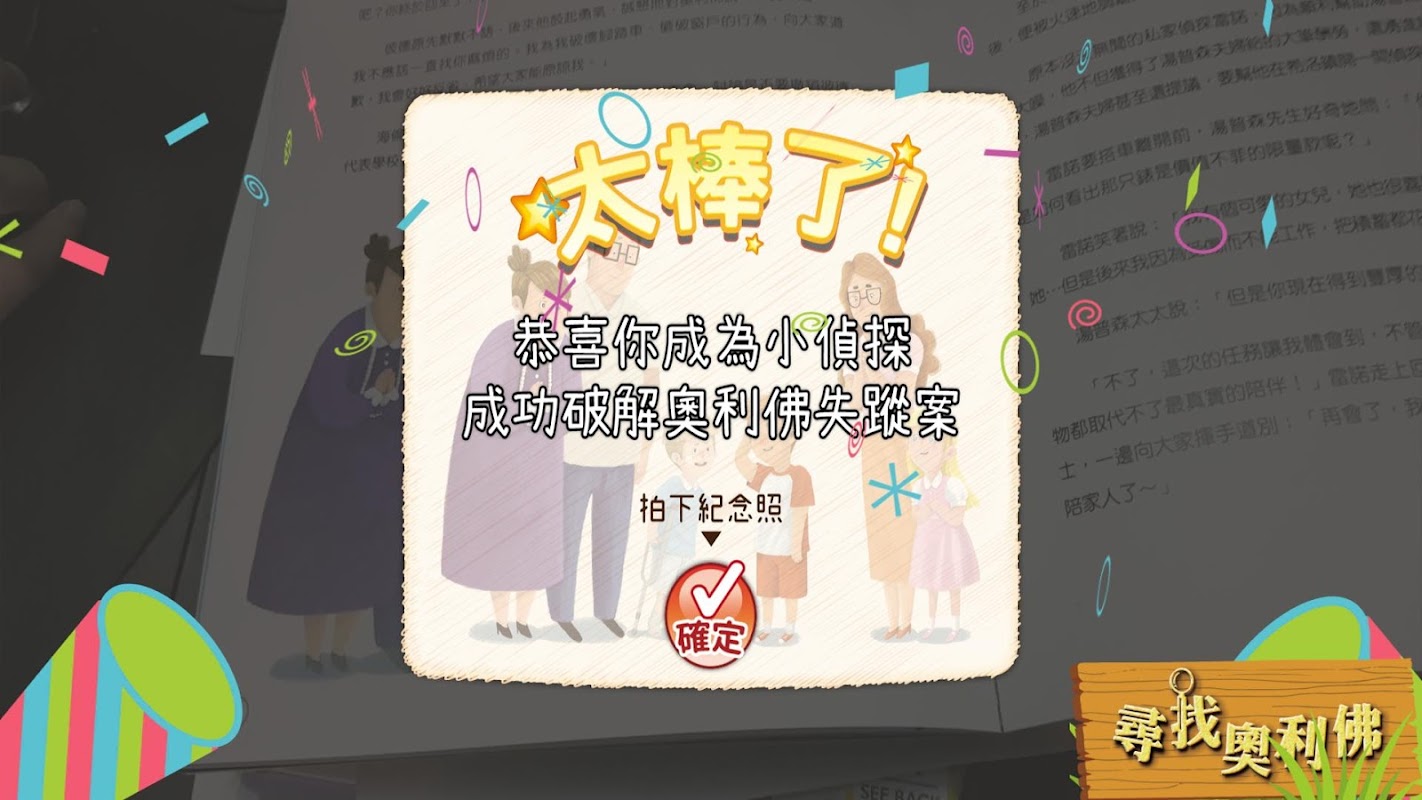 以手機或平板掃描實體故事書或是線上電子書,透過AR立體呈現,帶領操作者跟隨著偵探的腳步,一步一步的挖掘奧利佛失蹤事件背後的真相。