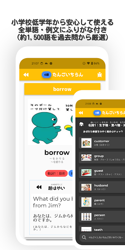 To nie wydawało się możliwe! Aplikacja do nauki słownictwa Eiken® z furiganą jest już dostępna! Tylko 5 minut dziennie! Wykorzystaj swój wolny czas, aby skutecznie nauczyć się około 1500 słów, które są często używane w klasach 3, 4 i 5 Eiken®. Bezpieczny nawet dla dzieci, które nie radzą sobie dobrze z kanji! Dzięki funkcji zarządzania postępami możesz szybko zobaczyć swoje wyniki! Żadnych reklam, zakupów w aplikacji i gromadzenia danych użytkownika! Jest to aplikacja do słownictwa Eiken®, z której naprawdę mogą korzystać uczniowie szkół podstawowych, ponieważ nie wymaga połączenia z Internetem i zapewnia dzieciom bezpieczne środowisko do samodzielnej nauki!