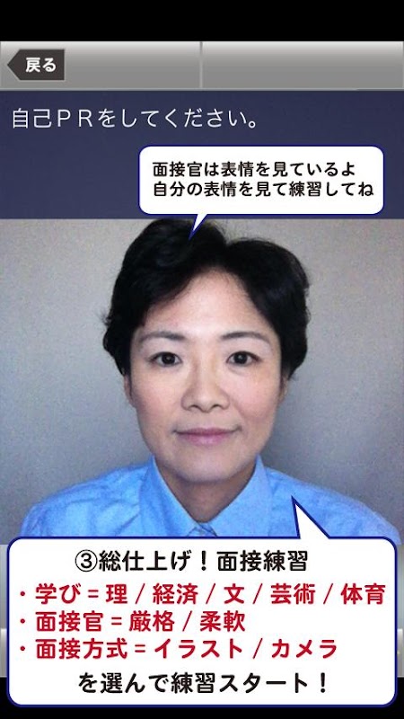 就活女子の金融系(銀行/証券/保険)面接対策アプリ。頻出質問に対する回答事例175個。文章編集機能付き。カメラで自分の表情チェックをしながら面接練習できる!