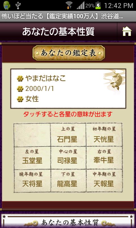 対面鑑定歴35年、のべ100万人を導いた「渋谷・道玄坂の母」。かつて花街だったこの地で、恋に人生に悩む芸妓から絶大な支持を得てきた母がついにAndroidアプリでも登場! 厳しく明快な占断に信奉者多数、政財界・芸能人・闇を抱える者たちも頼る極みの占術で、あなたが抱える悩みをお聞きします。怖いほど当たる、その真実をお聞きなさい!