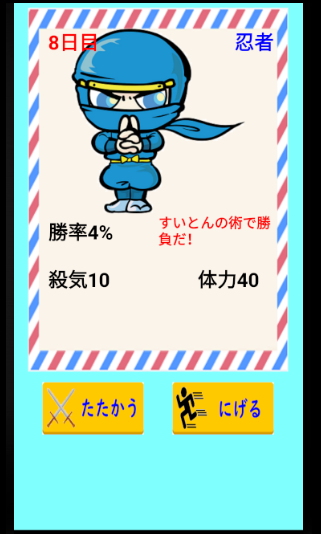 Łatwo jest grać. Po prostu wybierz "walcz" lub "uciec" podczas oglądania zwycięskiego procentu. Walcząc i tracąc, umrzesz. Jeśli uważasz, że nie możesz wygrać, ucieczka jest również rozdaniem, ale jeśli stracisz siłę fizyczną w wyniku zmniejszenia siły i fizycznej siły, skończysz grać. Najlepszym obecnie rekordem jest 112 dni! Kto wygra zwycięstwo?