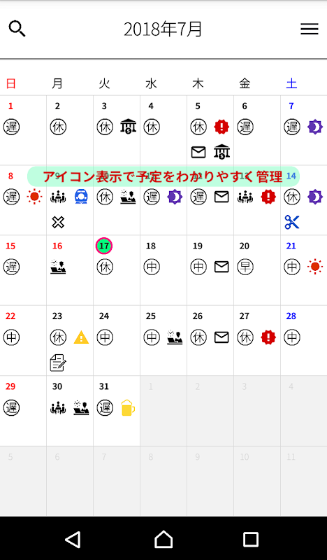 アイコン(カテゴリ)を自由に設定し、カレンダー上に表示することによりスケジュールを見やすく、かつ、わかりやすく管理できる手帳アプリです。