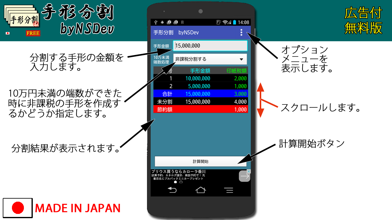 手形の印紙税を少しでも少なくするために手形をできる限り少ない枚数で効率よく分割するアプリです。