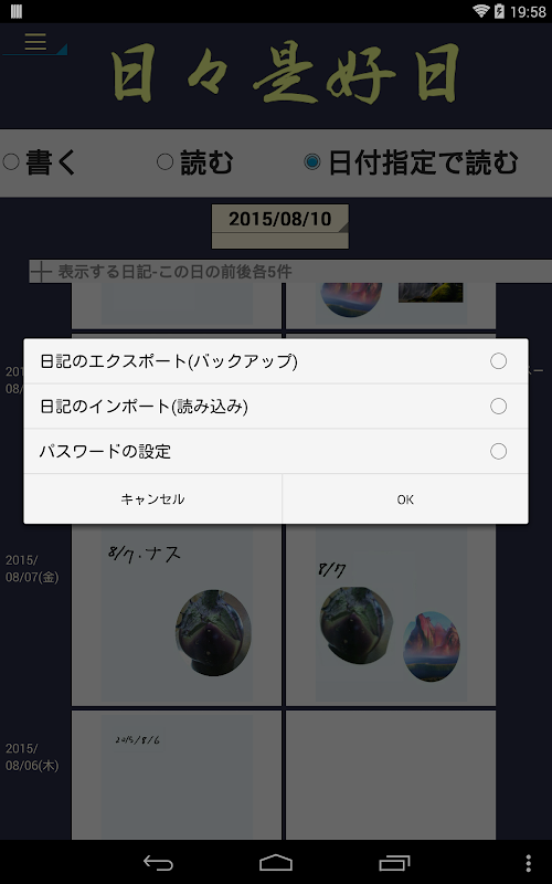 タブレットで日記を書こう! 画像/写真と手書き文字だけの日記アプリ。 画像/写真は簡単に編集できる。 過去10年間の同じ日の日記を並べて見られる。