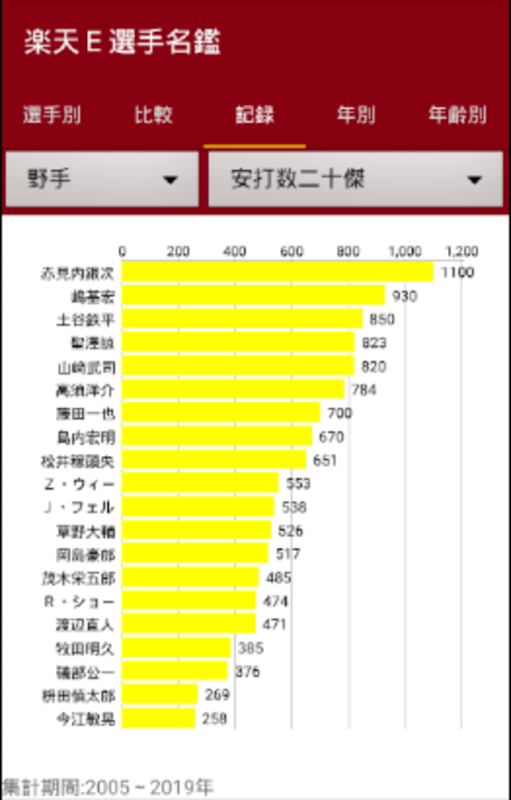 2005年の球団創設以来在籍した選手のうち、2019年までに一軍出場した選手の個人成績を収録したアプリです。