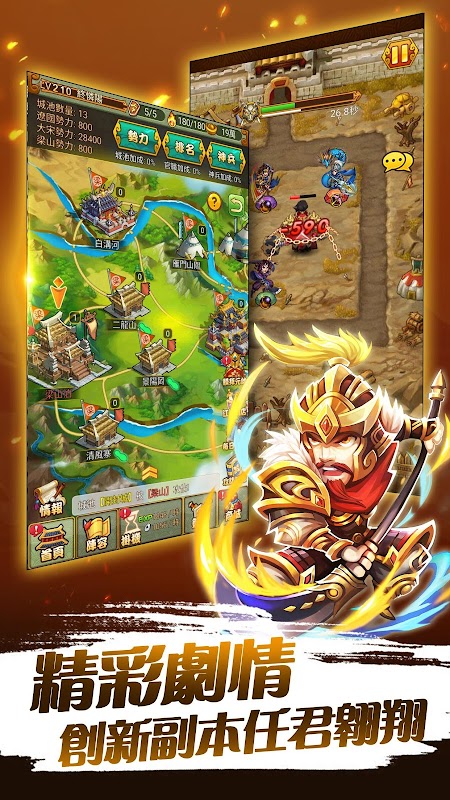 數張唯美地圖,百種經典武將,千件裝備道具,如何利用兵種相克與武將緣分發揮最大戰力守衛城池?靈活搭配上場武將,巧使妙計窺敵情,在這硝煙彌漫的戰場上,唯有策略至上方可壹統天下!