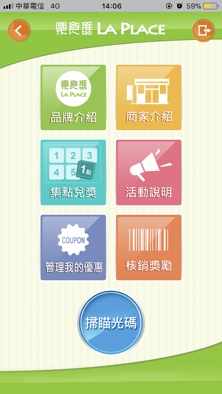 答:使用者下載APP後,可於樂食匯廣場尋找廣告數位看板或是各個店家的LOGO或菜單燈箱,點擊「掃描光碼」按鈕並持手機對準光源,便可取得優惠券或累積點數。