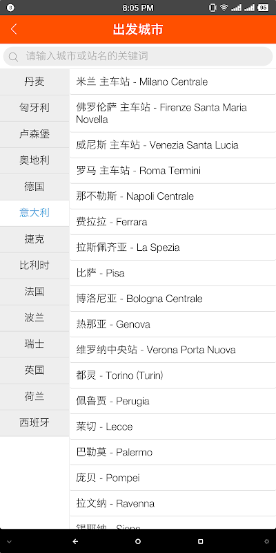 支持欧洲几十个国家的火车时刻表和票价查询。显示价格与铁路官网同价,免出票费、订座费、附加费。 意大利国铁 Trenitalia 与私铁 Italo(法拉利火车)全车型全时刻覆盖。 出电子票可直接扫码验票无需换票。提供中文微信客服咨询和代预订。