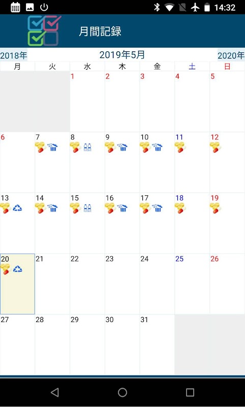 また一日の記録ページでは、それぞれの日のチェック項目を確認することができ、またそこで直接チェックをすることもできます。