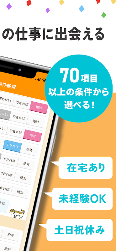 Możesz wyszukiwać oferty pracy w całym kraju według pożądanych warunków, takich jak zawód, miejsce pracy, stawka godzinowa, godziny pracy, długoterminowa lub krótkoterminowa. Na przykład możesz wyszukiwać warunki, takie jak „3 dni w tygodniu”, „do godziny 16:00” i „w ramach wsparcia osób na utrzymaniu”, zawody takie jak „praca administracyjna”, „wprowadzanie danych” i „sprzedaż” oraz wynagrodzenia, takie jak „1600 jenów za godzinę” i „10 000 jenów dziennie”.