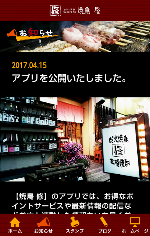 このアプリでは、【焼鳥修(やきとりしゅう)】の最新の情報をいち早くお届けしたり、
