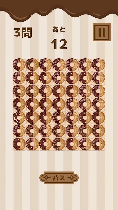 Poziomy trudności to „Początkujący” (5 x 5 kwadratów, 1 rodzaj słodyczy i tylko jeden inny słodycz), „Średniozaawansowany” (6 x 6 kwadratów, 2 rodzaje słodyczy i tylko 1 inny słodycz) oraz „ `Zaawansowane'' '' (7 x 7 kwadratów, 3 rodzaje słodyczy, tylko jeden inny słodycz) W sumie są 4 rodzaje słodyczy o podobnych kolorach i kształtach. Pozostały czas, liczba poprawnych odpowiedzi i przycisk pauzy są wyświetlane w górnej części ekranu, a przycisk Pass znajduje się w dolnej części ekranu. Rozwiąż jak najwięcej problemów w określonym czasie i celuj w wysoki wynik!