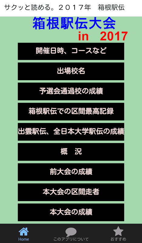 2017年の正月開催の箱根駅伝の概要をまとめた無料のアプリです。出場校や選手、前大会の結果などの情報を簡略化して、ひとまとめにしてあります。
