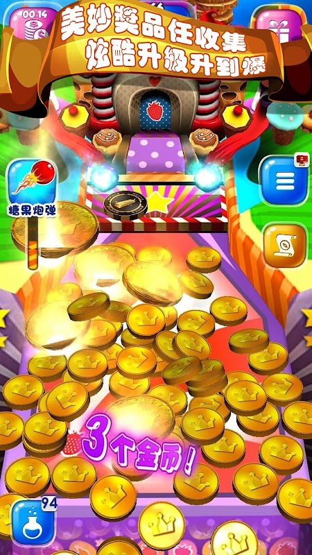 進入美味的糖果世界,通過向嘉年華推幣機中投入源源不斷的金幣,妳就能將成堆的美味糖果推出來,在推金幣的過程中享受令人垂涎的豐厚獎勵。