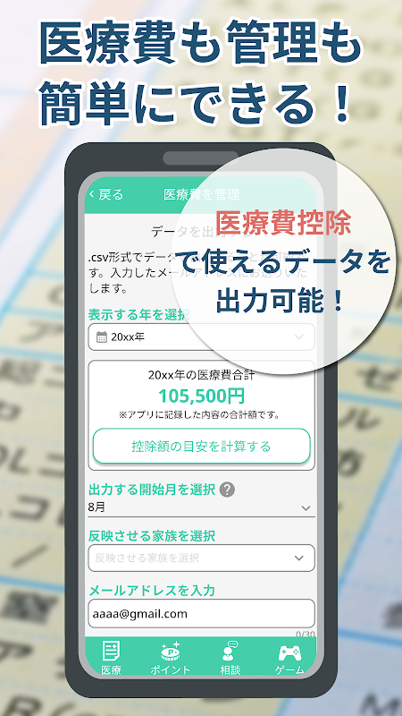 家族の分も一緒に管理できて、csvデータをダウンロードできるので、医療費控除の申請にそのまま使うことができます。