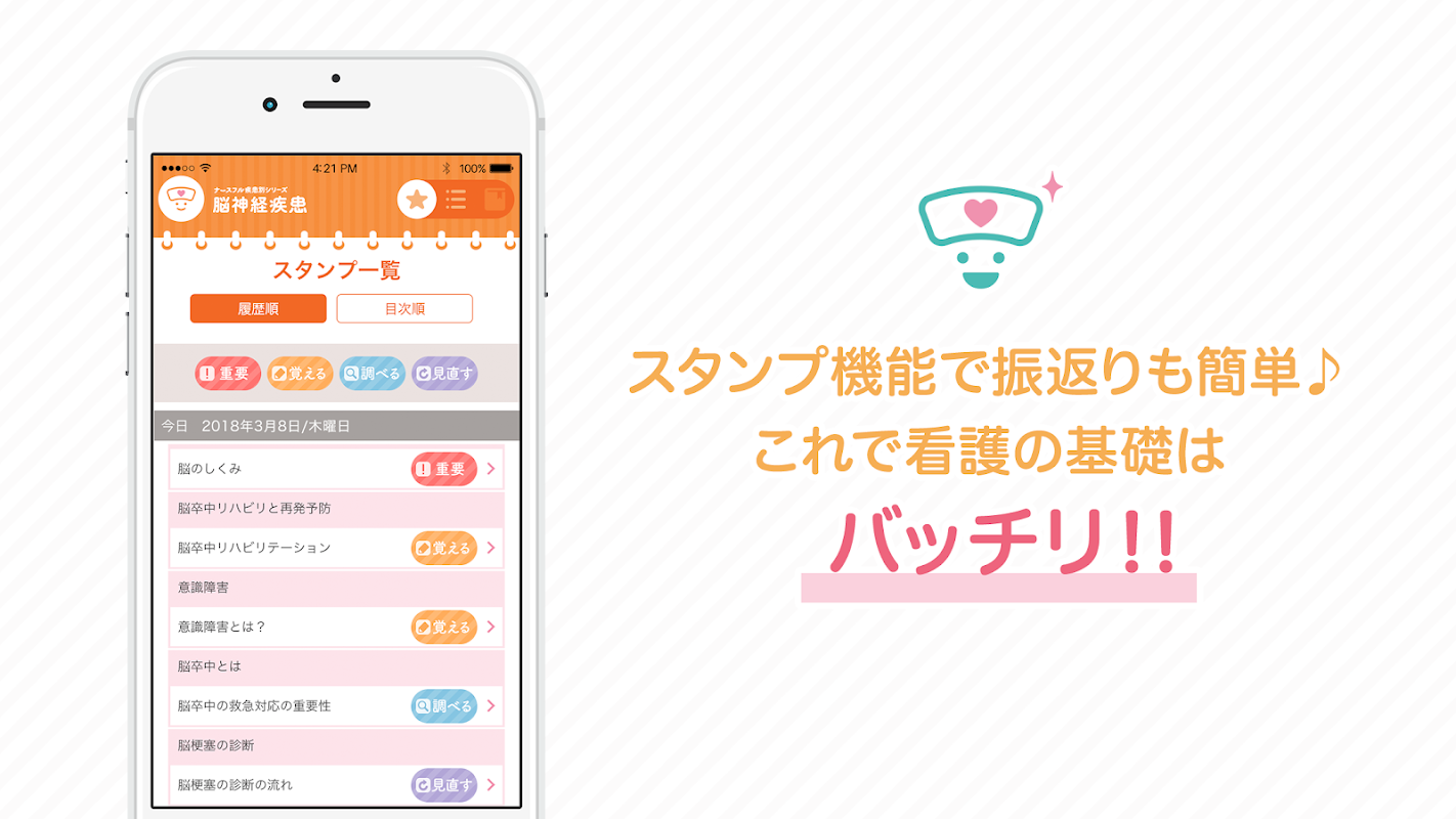 看護師さんが押さえておきたい「脳神経疾患」の看護の基礎をいちから学べるアプリ♪わかりやすい解説&使いやすい機能で、多忙な看護師さんのお勉強をしっかりサポート!