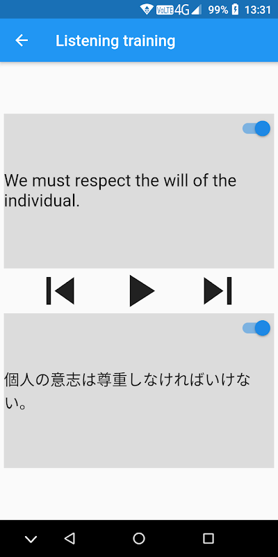 4. アプリで再生アイコンをタッチすると、ランダム順に英文、和文を表示しながら再生を続けます。