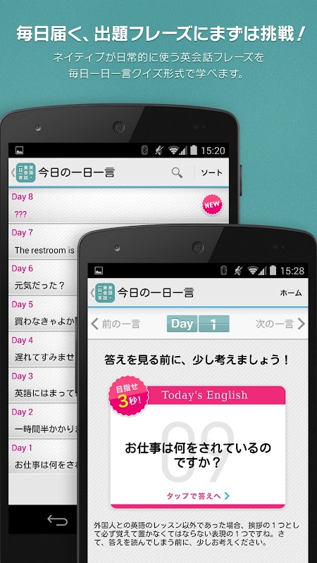 このアプリでは、ネイティブが日常的に使う英会話フレーズを毎日一日一言クイズ形式で学べます。