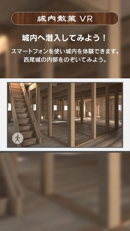 デジタルで復元された西尾城内部を、まるで城の中を歩くように自由に移動できます。