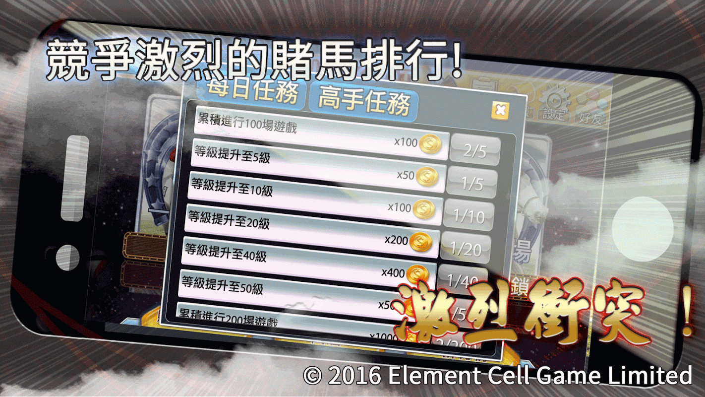 玩家可依自身實力與財力在不同級別的馬場間自由選擇。當賭本不足時,也可藉由完成任務與成就所獲得的獎勵來東山再起;或者透過郵件系統從好友處獲得籌碼;此外商城也售有籌碼商品可供挑選,讓玩家再無後顧之憂。