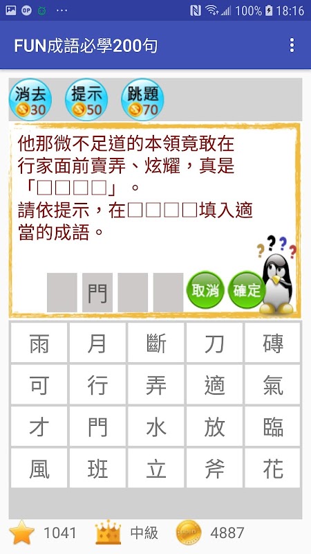 W grze, jeśli gracz napotka trudności i nie może rozwiązać problemu, może użyć złotych monet, aby kupić „wyeliminuj”, „podpowiedź” i „przeskocz pytanie”, aby przejść poziom