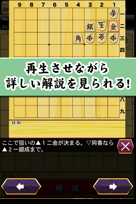 「詰将棋を解く」をタッチすると作品が表示されます。 攻方の駒をタッチすると選択状態になりますので、移動させたい箇所の盤上をやはりタッチします。 正解手ならば玉方が自動的に対応してくれます。不正解ならばその場で初手からやり直しになります。