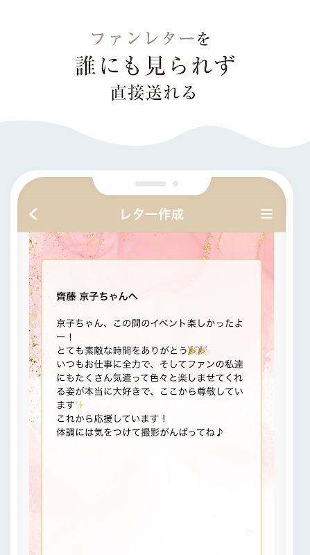 Oficjalna wiadomość Kyoko Saito to usługa, w której możesz otrzymywać bezpośrednie wiadomości (teksty/zdjęcia/wideo/audio) od Kyoko Saito i wysyłać bezpośrednio do niej listy od fanów.