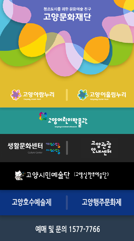 고양문화재단은 고양어울림누리 고양아람누리 및 고양어린이박물관, 고양시관광안내센타, 생활문화센터, 문화학교 등을 운영하고 있는 문화예술기관입니다