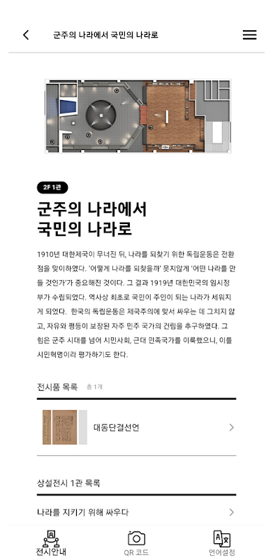 Jako aplikacja do komentowania wystawy stałej w Muzeum Narodowym Tymczasowego Rządu Republiki Korei, rozpoznając kod QR, możesz korzystać ze zdjęć, opisów i usług w czterech językach głównych artefaktów.