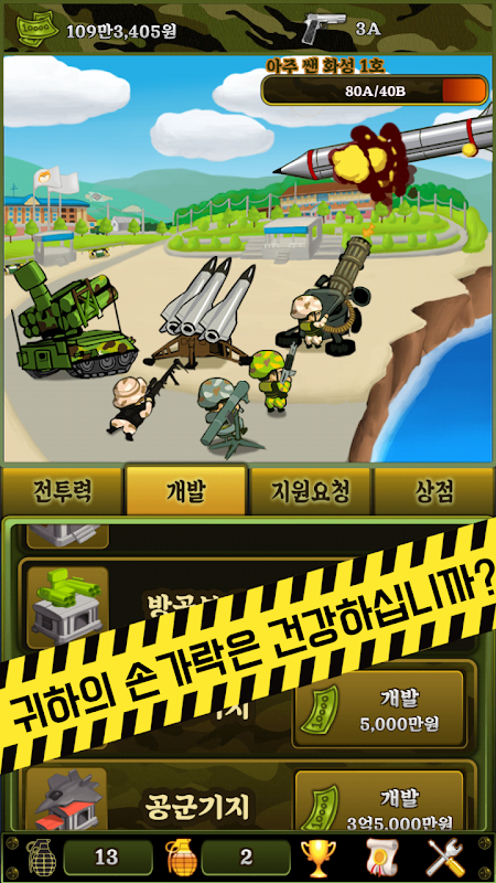 이 게임은 타격감과 미사일을 터트렸을때 쾌감이 느껴지는 클릭커입니다. 외계인 출현을 클릭하시면 수류탄을 획득하실 수 있는 기회 또한 있습니다. 즐겁게 게임하시길 바라겠습니다. 감사합니다.