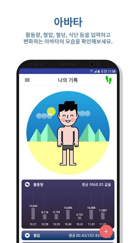 굿버디는 활동량, 혈압, 혈당, 식단, BMI 상태에 대한 추적을 통해 개인의 건강상태에 따라 아바타의 형태가 바뀌며 직관적으로 여러분의 상태를 확인할 수 있도록 도와줍니다.