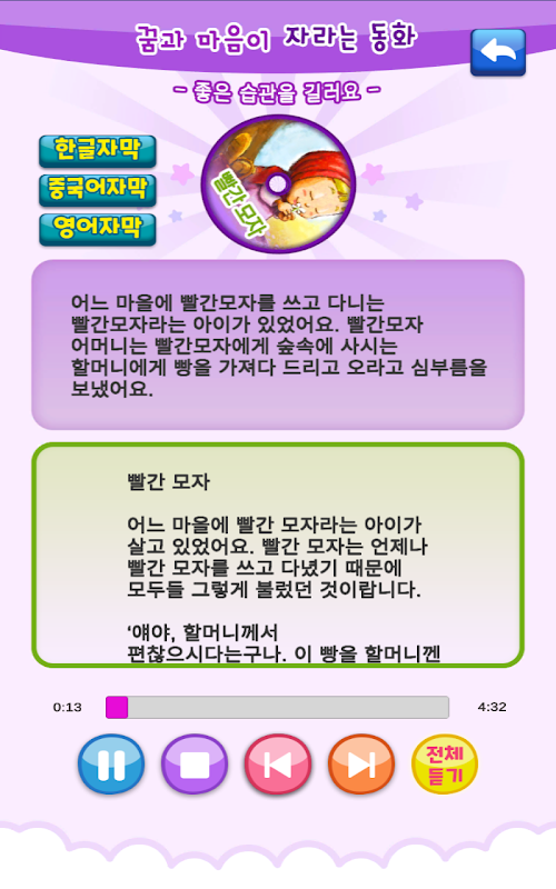 Dreamy Fairy Tales to opowieść z różnymi materiałami czytanymi przez matki i rodzimych użytkowników języka, składająca się ze 100 koreańskich dubów i napisów, 50 angielskich dubów i napisów oraz 100 chińskich napisów.